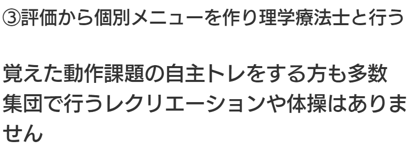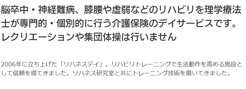 脳卒中・神経難病、膝腰や虚弱などのリハビリを理学療法士が専門的・個別的に行う介護保険のデイサービスです。レクリエーションや集団体操は行いません