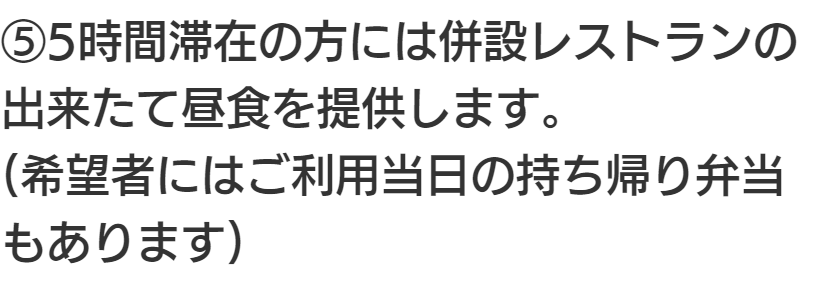 ⑤5時間滞在の方には併設レストランの出来たて昼食を提供します。